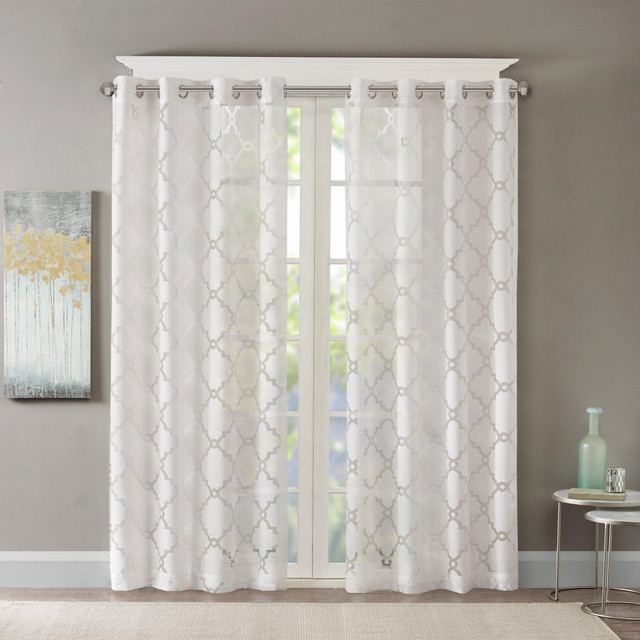 Stylish yet delicate, the Madison Park Eden Fretwork Sheer Curtain will update and soften any room. The lightweight sheer fabric features a burnout fretwork design on a ivory ground, for a dimensional and airy look. Finished with a grommet top detail making it easier to hang, open, and close panels throughout the day. Fits up to 1.25 diameter rod.