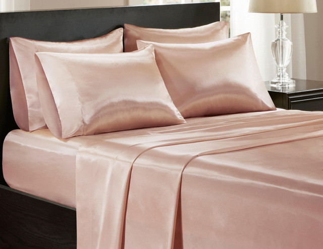 These silky high luster wrinkle-free satin 6-piece sheet set are luxurious to sleep on. Two additional pillowcases are included in this set for your sleeping comfort. Unlike cotton sheets, the satin sheet does not shrink and ready to use without iron/steam. Fits up to a 16-inch mattress. Set includes 1 Flat Sheet, 1 Fitted Sheet and 4 Pillowcases.