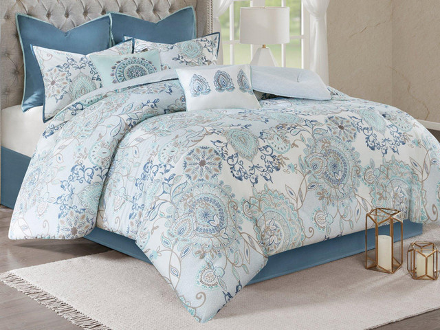 Madison Park Bedding Set features a botanical floral and medallion design in blue tones. Set includes comforter, two pillowshams, two european pillowshams, bedskirt, and two decorative pillows. Pillows measure 18'' x 18'' and 12'' x 18''.