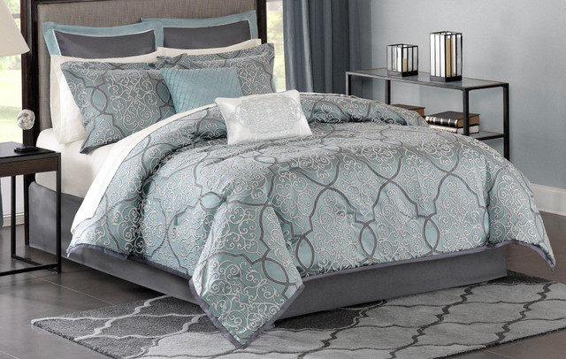 The Madison Park Lavine Collection provides a rich update to your master bedroom. Its jacquard woven fabrication has a three-dimensional affect giving this decorative design life. Set includes comforter, bed skirt, flat sheet, fitted sheet, 2 pillow shams, 2 euro shams, 2 pillow cases & 2 decorative pillows. Pillows measure: 18'' x 18'' & 12'' x 18''.