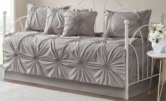 Madison Park Bedding Set features a a solid color with ruched deatils. Set includes day bed cover, three pillowshams, bedskirt, and one decorative pillow. Pillow measures 18'' x 18''.