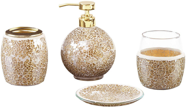 Add an alluring radiance to your bathroom with the Madison Park Mosaic 4 Piece Bath Accessory Set. Flaunting a crackle glass mosaic design, this bathroom accessory set includes a soap dispenser, toothbrush holder, a tumbler, and a ring dish. Maximize your counter space by incorporating this accessory set in your bathroom for a glamorous touch.