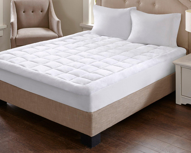 This Madison Park Cloud Soft Overfilled Plush Hypoallergenic Down Alternative Waterproof Mattress Pad will make you feel like your sleeping on clouds. It's designed to be waterproof for lasting comfort and durability and overfilled for added loftiness. Skirt is 15'' and is polyester/spandex knit fabric with box quilting.