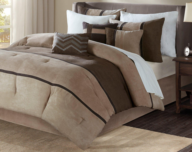 The Madison Park 7 Piece Palisades Comforter Set soft microsuede in heather grey, brown and charcoal grey is pieced together to create this beautiful bed. Reverses to a solid brown. The decorative pillows are embroidered and pieced to add a decorative element to this simple comforter. Set includes comforter, 2 pillow shams, 1 bed skirt (15'' drop), and 3 decorative pillows. Pillows measure 16'' x 16'', 18'' x 18'', and 12'' x 18''.