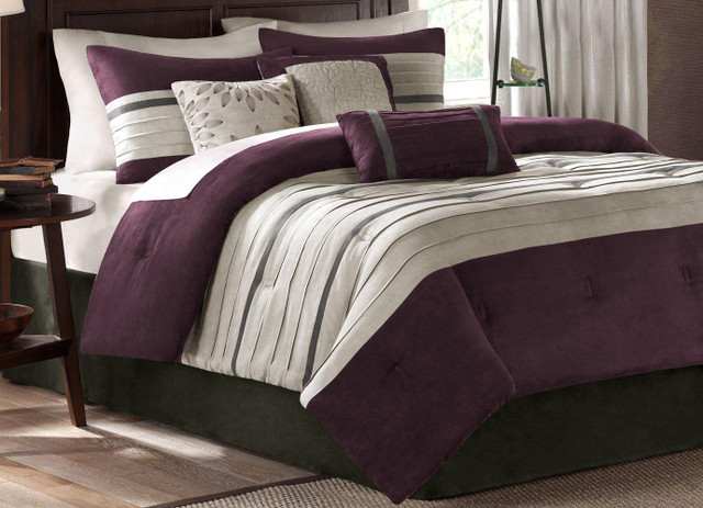 Madison Park Palmer Plum Set features pieced micro suede for a soft feel while adding texture and color. Set includes comforter, 2 pillow shams, 1 bed skirt (15'' drop), and 3 decorative pillows. Pillows measure 16'' x 16'', 12'' x 20'', and 18'' x 18''.