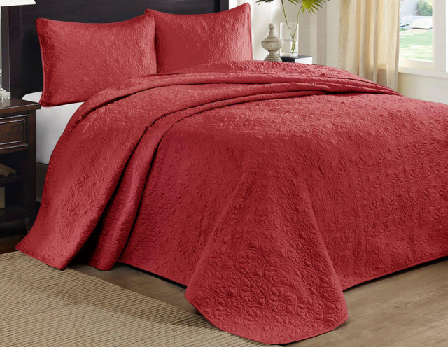 Madison Park Quebec Reversible Bedspread Set is the perfect bedspread to use as a layering piece or an alternative to your comforter for a new solid look. The classic stitch pattern pairs easily with your existing décor and will sure to add a new decorative element to your bedroom. The bedspread has 100% cotton fill while the face and reverse are a super soft brushed fabric. Set includes bedspread and 2 shams (1 twin).