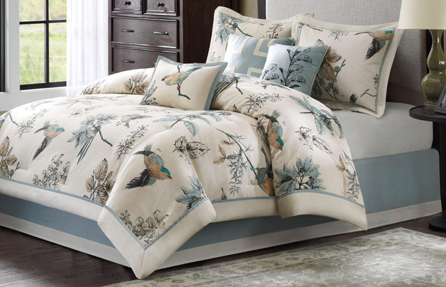Madison Park Quincy Set features warm tones of brown and blue to create a fun leaf print along with an ivory border edge. Set includes comforter, 2 pillow shams, 1 bed skirt (15'' drop), and 3 decorative pillows. Pillows measure 16'' x 16'', 18'' x 18'', and 12'' x 18''.
