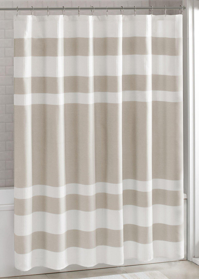 This 72 x 72 inch Madison Park Spa Waffle Shower Curtain features 3M water repellent scotch-guard treatment with large color blocking design. 100% polyester.