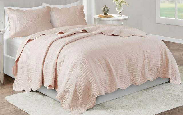 Madison Park Tuscany Scalloped Edge Coverlet Set is the perfect coverlet to use as a layering piece or an alternative to your comforter for a new solid look. The decorative stitch pattern pairs easily with your existing décor. This coverlet is filled with cotton filling and features a polyester microfiber fabrication on the face and the reverse. Set includes bedspread and 2 shams.