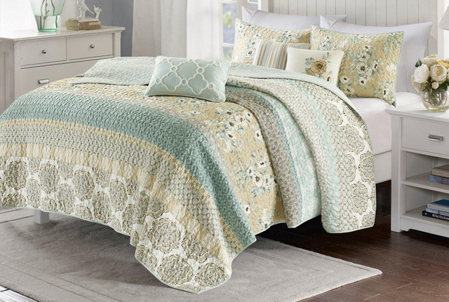 Madison Park Willa 6 Piece Reversible Coverlet Set features stripes with florals, medallions, and geometric designs in green and shades of yellow and taupe. Two shams pull the floral design from the coverlet and three decorative pillows. Set includes coverlet, 2 pillow shams, and 3 decorative pillows. Pillows measure 18'' x 18'', 16'' x 16'', and 12'' x 18''.
