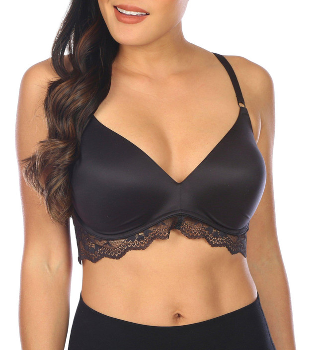 This wirefree bra features a solid color design with scalloped lace trim, natural shaping cups that provide natural lift, plunge front, convertible design for crisscross strap versatility, adjustable straps, and hook and eye back closure. Fabrication 82% nylon, 18% spandex. Style DM1196.