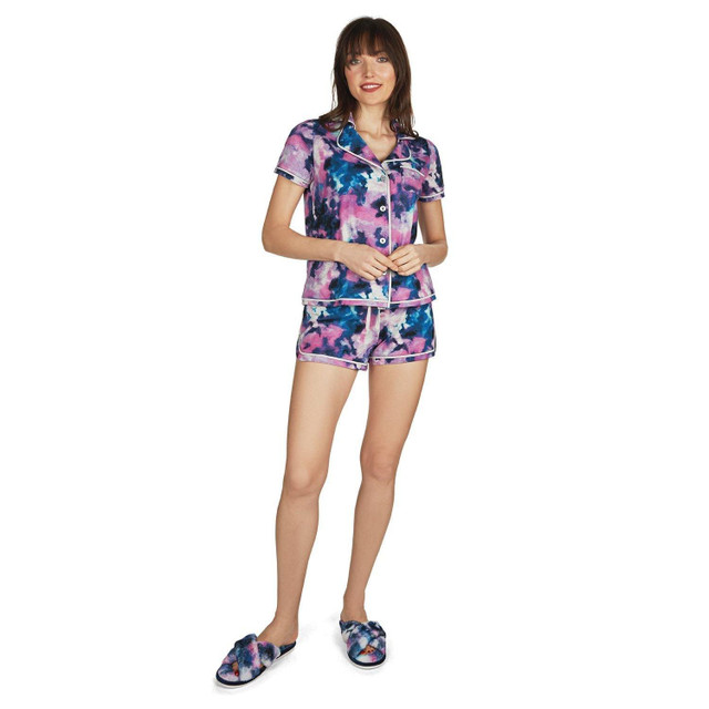 Get better zzzs in our Stardust Tie Dye Notch Collar PJ Set! It features a silky smooth and breathable button front top with short sleeves and a single chest pocket, and short bottoms that are flattering, lightweight, and finished with a classic contrast piping trim detail.Designed with an adjustable and stretchy drawstring waistband that's ideal for napping, relaxing, and everything in between. Comes with a coordinating drawstring bag. Fabrication 55% cotton, 45% rayon.