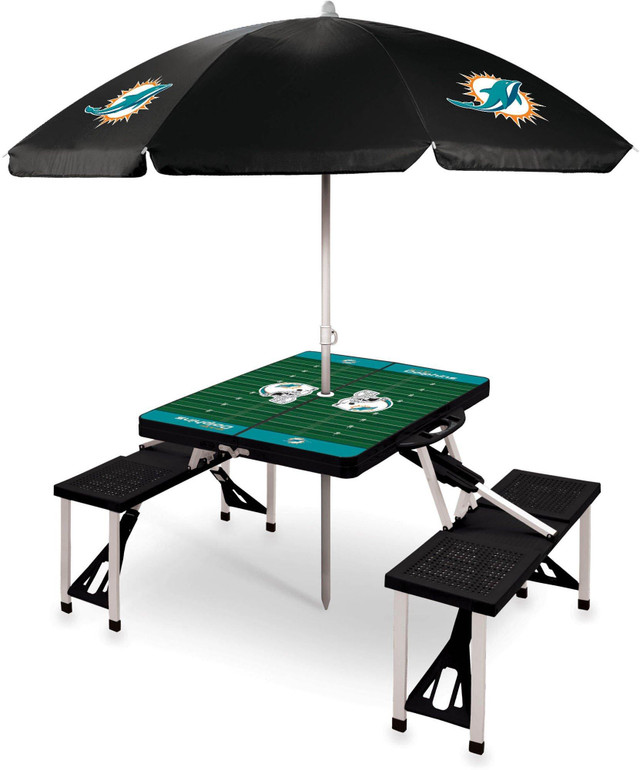 Picnic Time's portable Picnic Table has legs and seats that fold into the table when collapsed and has a maximum weight capacity of 250 lbs. per seat and 20 lbs. for the table. Includes a standard sized beach umbrella. Measures 34'' x 4.25'' x 66'' and weighs 20lbs.