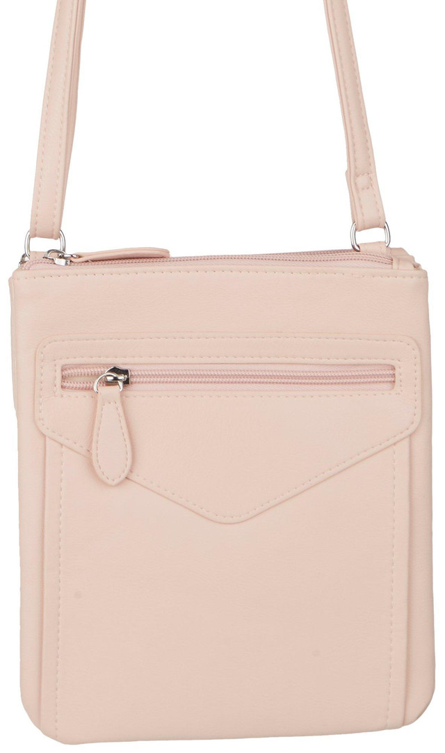 This Mundi Solid Double Compartment Vegan Leather Crossbody Bag features a solid color, soft vegan leather fabrication, an adjustable crossbody strap, RFID protection, a front zipper pocket, and dual top zippers. The two lined main compartments have one zipper pocket, and feature an exterior slip pocket between them. Measures 7 in. L x 1 in. W x 8 in. H. Strap drop is approximately 30 in.