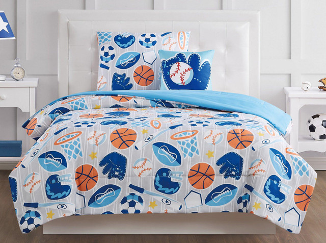 Take your pick with soccer, basketball, baseball, and football icons printed in bright blues on a gray base. The reverse of the bedding is a coordinating blue color. The ensemble comes with a decorative pillow with a baseball theme. Set includes one comforter, two pillow shams (1 twin), and one decorative pillow (16 x 16 inches).