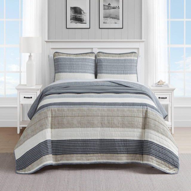 Playing tribute to Nautica's fashion, we have designed a classic look that is perfect for year round use in Nautica's ridgeport quilt set. Sandy hues of khaki paired with shades of neutral greys are shown in this play on stripes combining subtle pinstriping with large sections of texture for added dimension. With the quilt intended to be fully reversible, the reverse offers a grey printed stripe on textured ground for a versatile look.