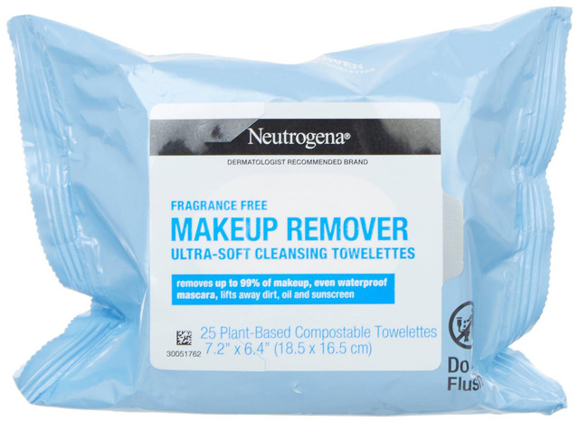 These Neutrogena 25-Pk. Makeup Remover Ultra-Soft Cleansing Towelettes are fragrance-free and contain a triple emollient blend to condition, leaving skin refreshingly clean with no heavy residue. Removes up to 99% of dirt, oil, sunscreen, and waterproof makeup. Contains 25 7.2 x 6.4 pre-moistened plant-based compostable towelettes.