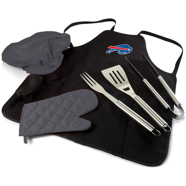 This Buffalo Bills 6 pc. barbecue set and apron conveniently folds into an easy-to-carry tote complete with an adjustable shoulder strap. It includes a polyester canvas full-size apron with adjustable criss-cross back straps and pockets for grilling accessories, a dark grey chef's hat, one stainless steel barbecue spatula with an integrated bottle opener, one stainless steel barbecue fork, and one stainless steel set of tongs.