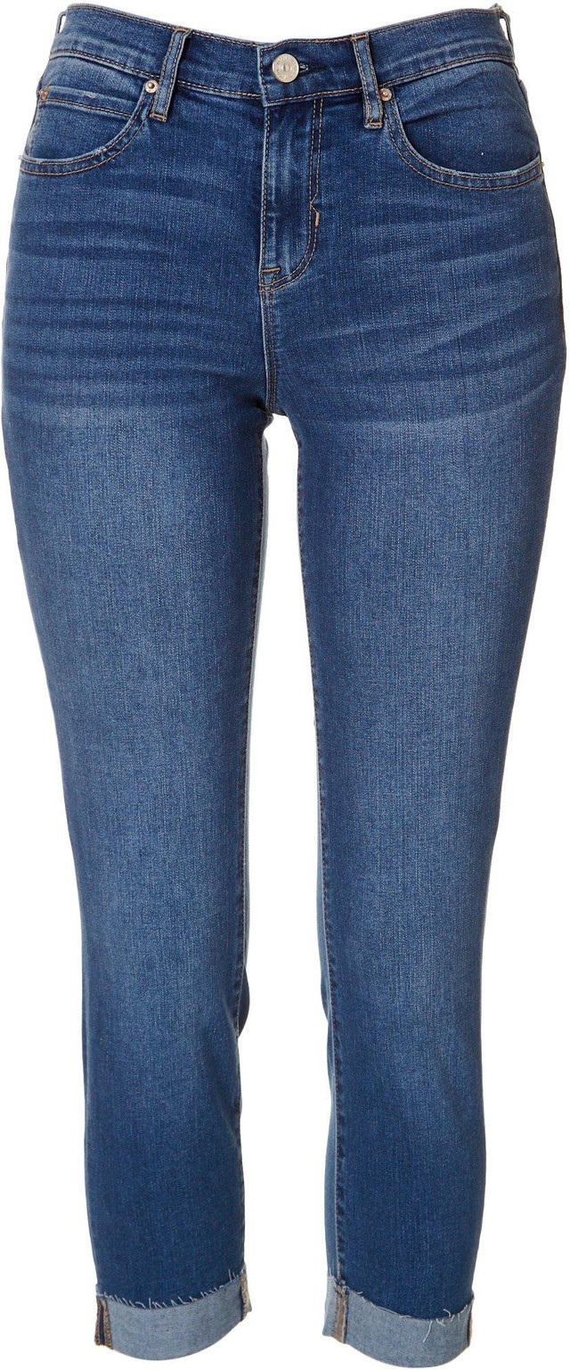 This pair of Nicole Miller New York denim capris offers a unique fit perfect for every wardrobe. They feature a high waisted design, basic five pocket construction, and a classic denim color that allows for effortless matching. Inseam is approximately 24 1/2 inches.