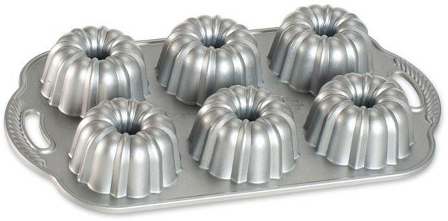 Created in celebration of Nordic Ware's 65th anniversary, this adorable miniature Bundt pan is a dessert maker's dream. Made of cast aluminum and has a PFOA-free nonstick coating that makes 6 bundtlette cakes. Measures: 8.625'' x 12.94'' x 2''.