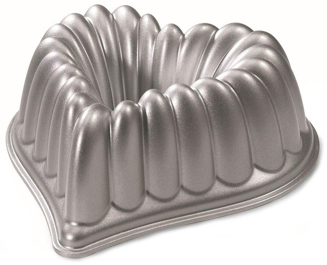 The simple beauty of this Nordic Ware Elegant Heart Bundt Pan will be a crowd pleaser year-round. Cast aluminum pan features 10 cup capacity & a PFOA-free nonstick coating. Lifetime warranty. 11''L x 10.4375''W x 3.875''H.