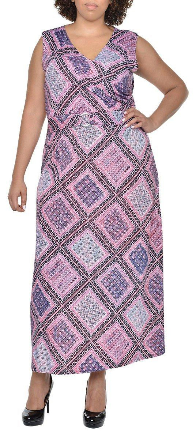 NY Collection brings a comfortable and stylish look to your wardrobe. This print maxi dress is the epitome of elegant and polished. Long A-line silhouette features a wrap-front neckline and a self-fabric belt that is attached and finished with a metal ring. Length is approximately 54 inches from size medium.