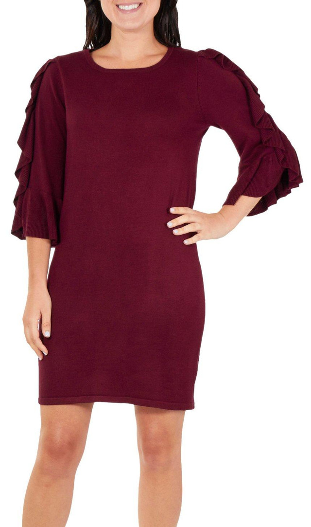 NY Collection brings a comfortable and stylish look to your wardrobe. Ruffles bring fancy feminine flair to this essential sweater dress offering all-day style from coffee to cocktails. Length is approximately 36 inches from size medium.