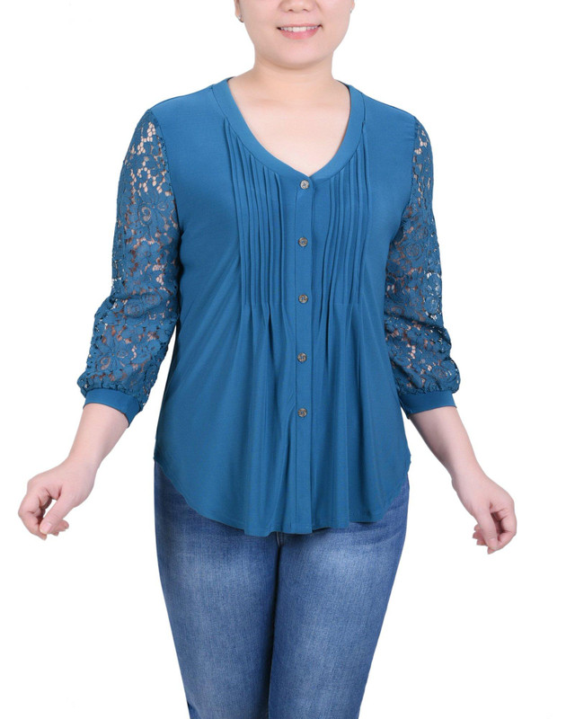 This Petite lace-sleeved top from NY Collection is just what you need to complete your wardrobe this season. The lace adds a feminine flair while still being easy to wear