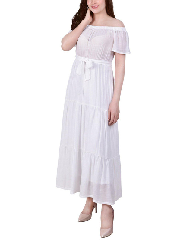 Ideal for breezy, warm days and nights, NY Collection's off-the-shoulder maxi dress is made picture perfect with romantic ruffled sleeves, a tiered skirt and a belt.