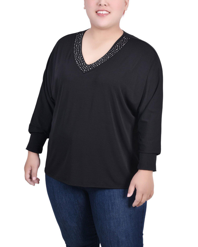NY Collection Womens Plus Size Long Sleeve Studded Top