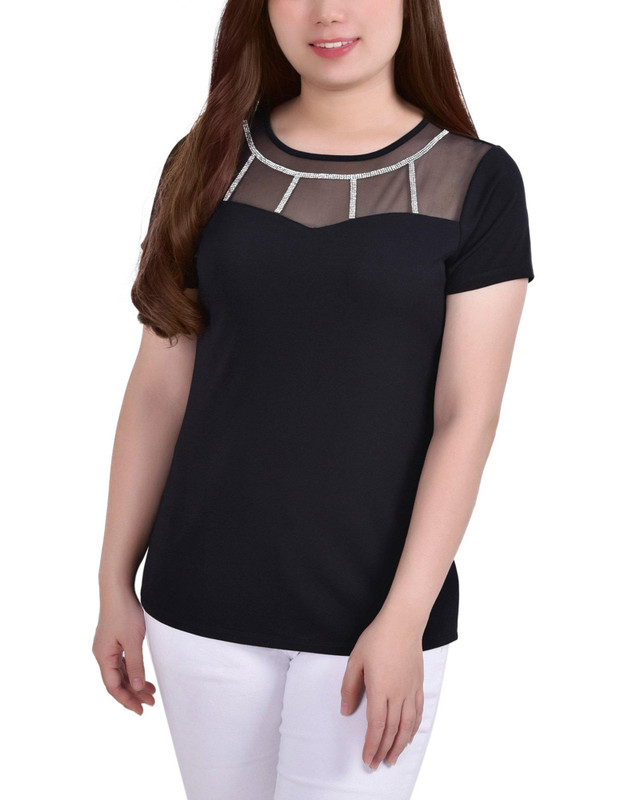 NY Collection Womens S/S Crepe Knit Stone Detail Top