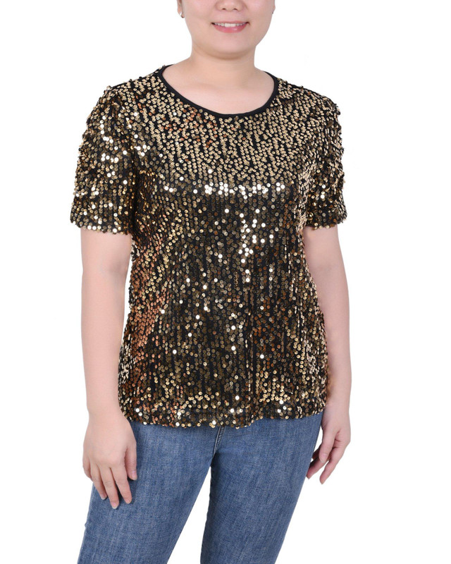Stand out in a crowd this holiday with this NY Collection Petite sequined rouched-sleeve top. Pair with a velvet pant or skirt for a perfectly put together look this season.
