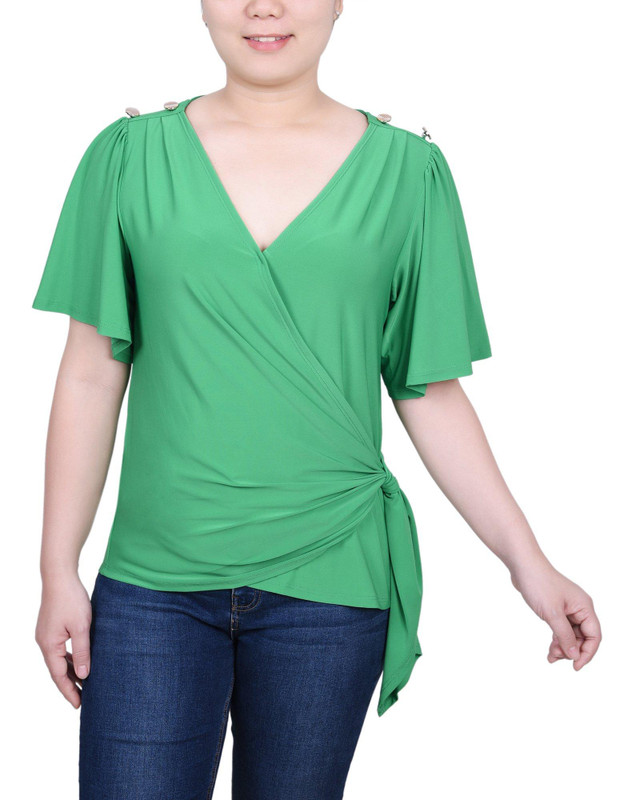 Feminine and flattering in a wrap silhouette,this collared top from Petite NY Collection features a flutter sleeves and decorative shoulder buttons.