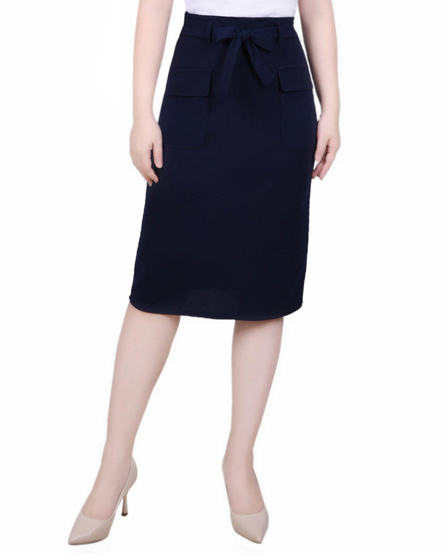 NY Collection presents this slim scuba crepe skirt with a self belt and front patch pockets with flaps. Offered in several colors to satisfy your every mood.