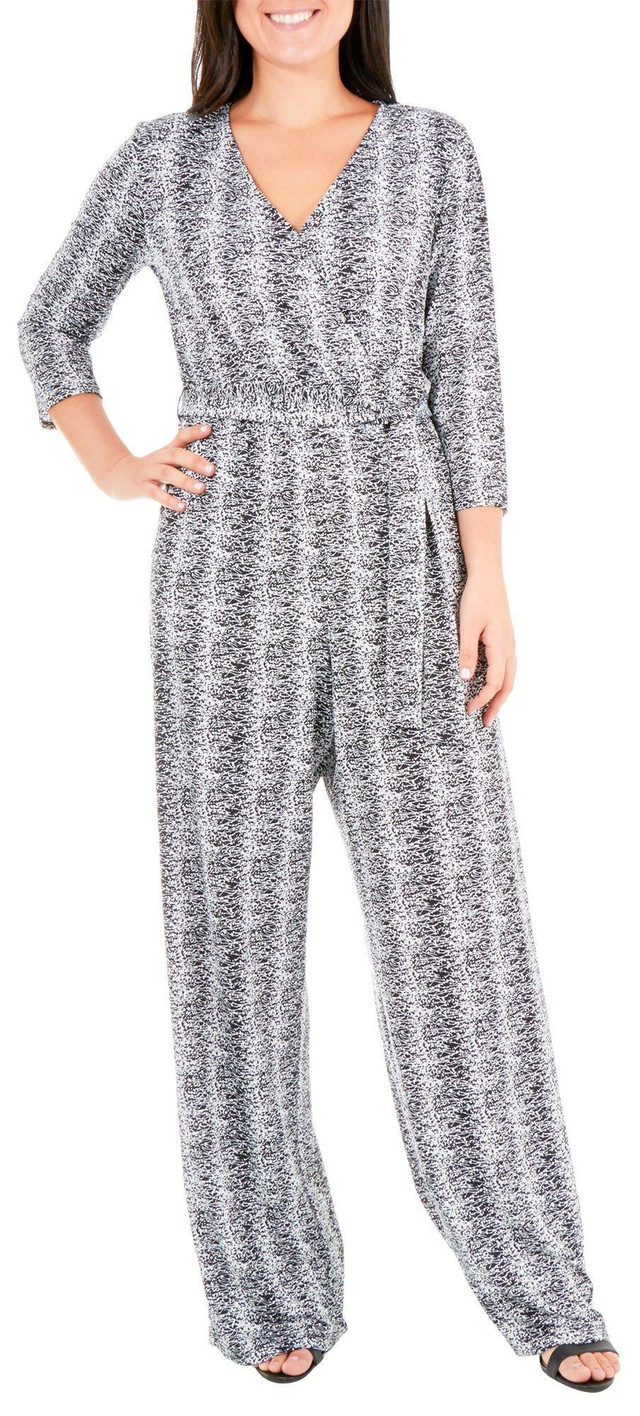 NY Collection brings a comfortable and stylish look to your wardrobe. This stripe wide leg jumpsuit gets an edgy update with grommets along the wrap front collar and waist tie. Cut in a stretch fabric with three-quarter sleeves and pockets for high-styled comfort. Inseam length is approximately 32 inches from size medium.