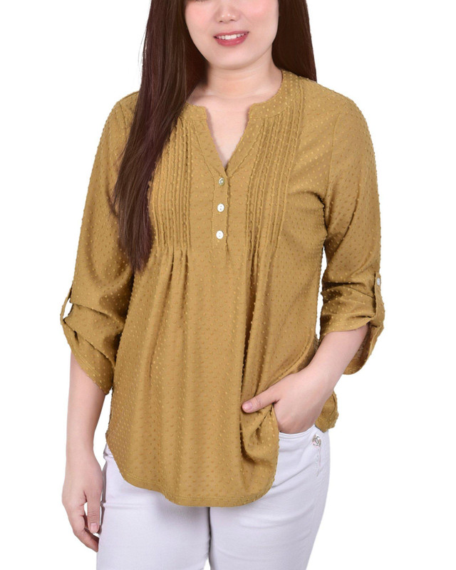 This blouse from NY Collection will be a new favorite. This Swiss Dot Pleated Front Blouse features a classic swiss dot design with pleated front details and roll tab sleeves.