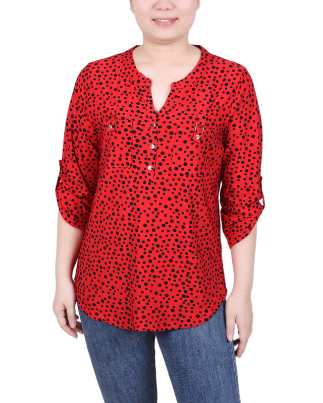 We've adding pocket details to our best-selling blouse. This curved hem top from NY Collection features tabbed pockets with hardware and roll-tab sleeves.