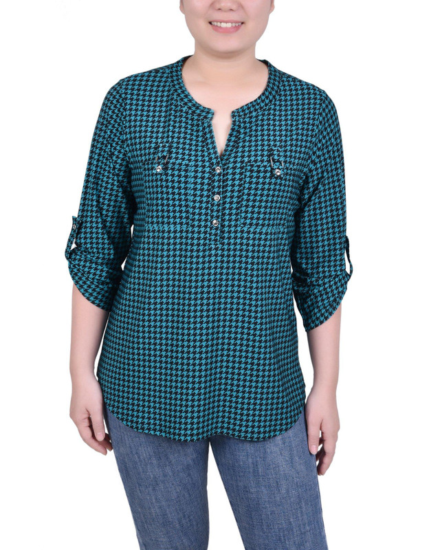 We've adding pocket details to our best-selling blouse. This curved hem top from NY Collection features tabbed pockets with hardware and roll-tab sleeves.