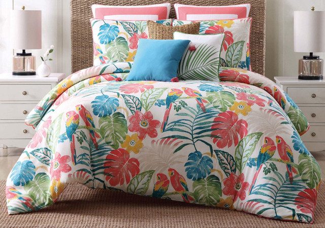 Bright palm prints dominated by a coral color with printed parrots hidden in the main face fabric of the comforter and shams. The casual feel take you back to the beach place with those lazy days and warm nights. Duvet insert not included and should be pruchased separately.