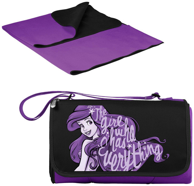 The topside of the blanket is made of soft polyester fleece and the underside is water-resistant to protect the blanket from getting dampened or soiled. The Blanket Tote features Little Mermaid decoration, unfolds easily and refolds into a convenient carry tote featuring a closing flap complete with a zippered pocket, and an adjustable shoulder strap. Measures 13'' x 8'' x 3'' folded and 59'' x 51'' open.