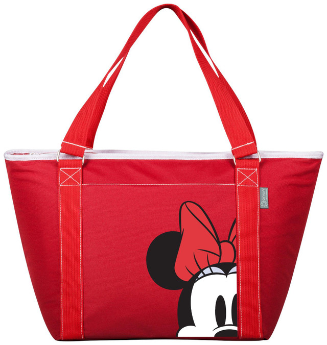 The Topanga cooler tote is made of durable polyester with Minnie Mouse decoration and features a separate exterior pocket. Interior features heat-sealed PVC for no leaks and it is large enough to carry 24 soda cans. Measures: 21'' x 8.7'' x 13''.