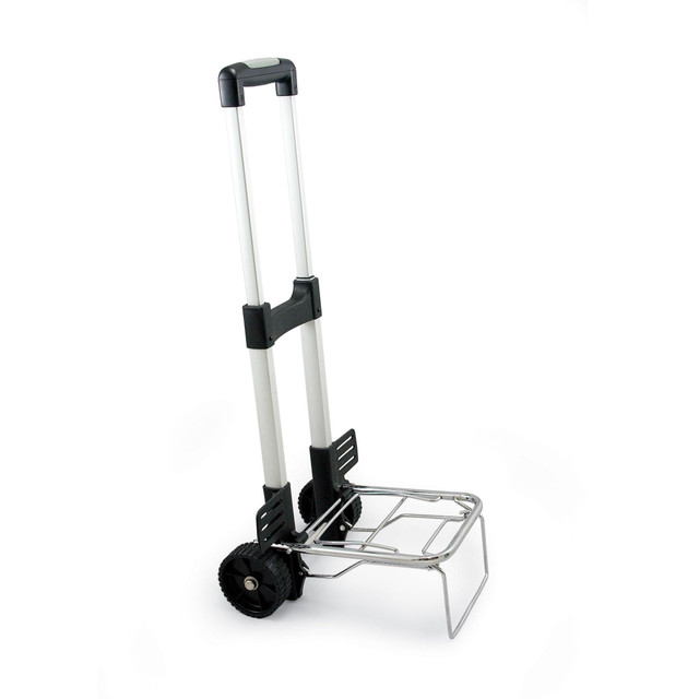 39 tall with telescoping handle; Stabilizing bar; Two expansion bars at its base; 4 All-terrain wheels; Maximum load capacity of 77 lbs. Trolley measures: 39 in x 18 in x 7.5 in.
