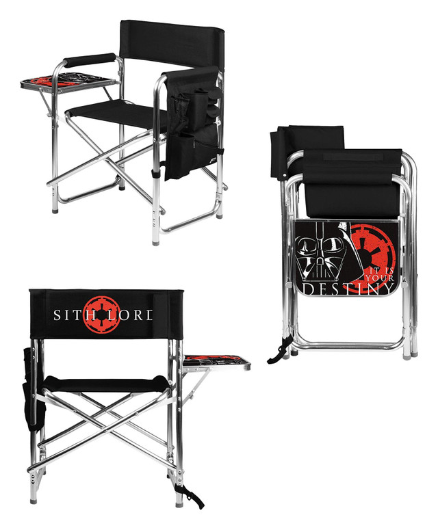 The Star Wars Darth Vader Folding Sports Chair by Picnic Time features a sturdy aluminum frame, adjustable detachable shoulder strap, side pockets, & insulated drink holders. Chair features 19.5'' wide seat and holds up to 300 lbs. Folded measures 19 x 4.5 x 33 inches and expanded measures 19 x 24 x 33. Side table measures 14.5 x 11 inches and holds up to 10 lbs.