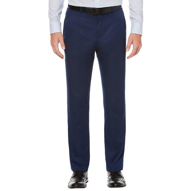 Perry Ellis offers superior quality and value with modern, innovative sportswear. These flat front performance dress pants feature two front pockets, button-through back pockets, sits below the waist, straight leg, regular bottom opening, flex stretch waistband, and a modern fit. Fabrication 39% recycle polyester, 34% polyester, 21% viscose, and 6% elastane. Inseam measures 33 inches. Outseam 42.5 inches.