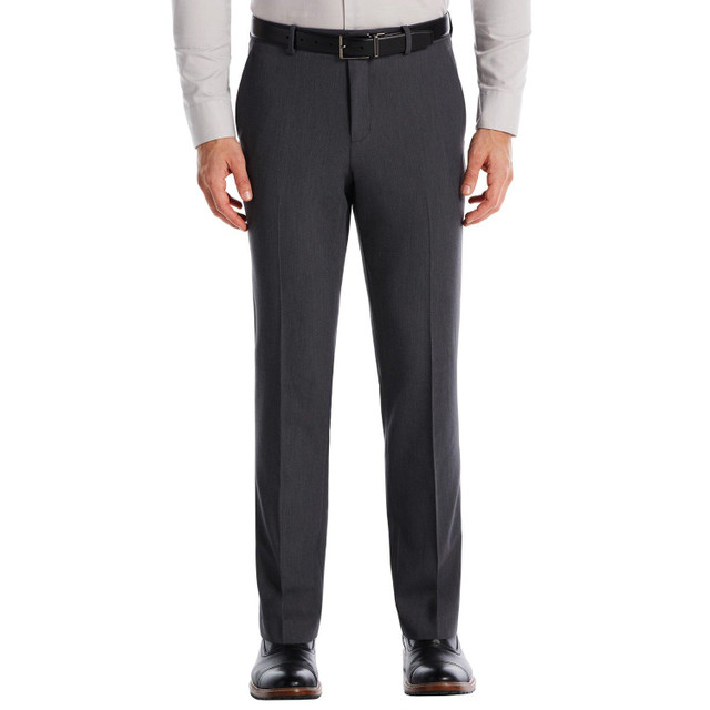 Perry Ellis offers superior quality and value with modern, innovative sportswear. These flat front performance dress pants feature two front pockets, button-through back pockets, sits below the waist, straight leg, regular bottom opening, flex stretch waistband, and a modern fit. Fabrication 39% recycle polyester, 34% polyester, 21% viscose, and 6% elastane. Inseam measures 33 inches. Outseam 42.5 inches.