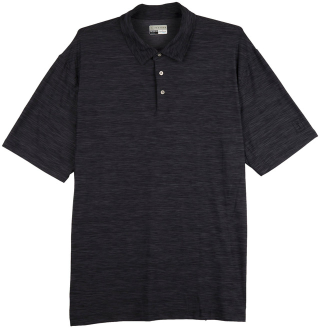 Gear up for the golf course in this polo shirt! This golf polo provides a three-button placket for easy on and off short sleeves, moisture wicking, easy care, single knit fabrication creates a lightweight material that is flexible and comfortable, Jaspe cotton creates a slight two-toned finish by weaving different colored yarns, and sun protection to keep you cool and dry, stretch shoulder seams for freedom of movement, and a subtle fine design. Fabrication is 92% polyester, 8% spandex.