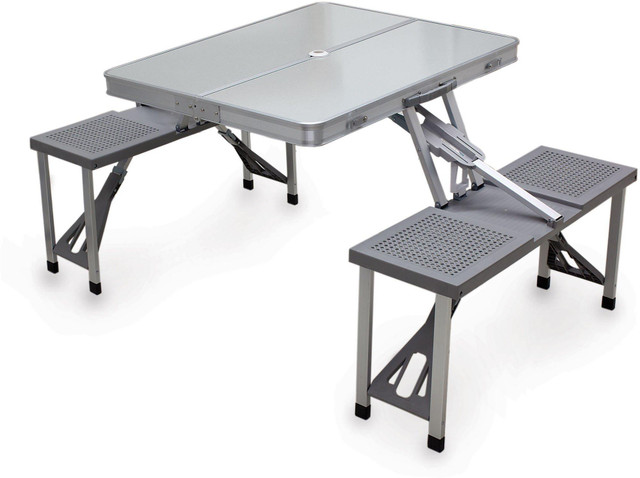 This picnic table is a compact fold-out table with legs and seats that fold into the table when collapsed. Maximum weight capacity of 250 lbs. per seat and 20 lbs. for the table. Compatible with standard sized beach umbrellas. Measures 34'' x 4.25'' x 15.5'', and weighs 24 lbs. Perfect for tailgating at your favorate sporting event: NCAA, NFL, MLB.