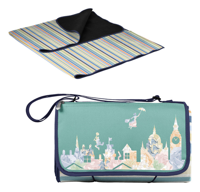The topside of the blanket is made of soft polyester fleece and the underside is water-resistant to protect the blanket from getting dampened or soiled. The Blanket Tote features Disney Mary Poppins, unfolds easily and refolds into a convenient carry tote featuring a closing flap complete with a zippered pocket, and an adjustable shoulder strap. Measures 13'' x 8'' x 3'' folded and 59'' x 51'' open.