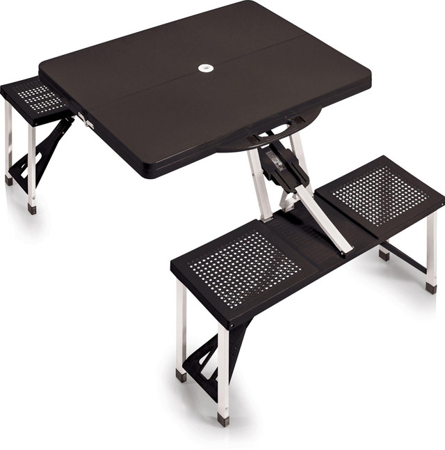 This picnic table is a compact fold-out table with legs and seats that fold into the table when collapsed. Maximum weight capacity of 250 lbs. per seat and 20 lbs. for the table. Compatible with standard sized beach umbrellas. Measures 34'' x 4.25'' x 15.5'', and weighs 24 lbs. Great for tailgating at your favorate sporting event, NCAA, NFL, MLB.