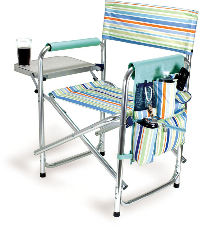 The Sports Chair by Picnic Time is lightweight & foldable with a sturdy aluminum frame and adjustable shoulder strap. Chair features extra-wide seat (19.5'') and is made of durable 600D polyester. Side table folds out and holds up to 10 lbs. Maximum weight capacity: 300 lbs.